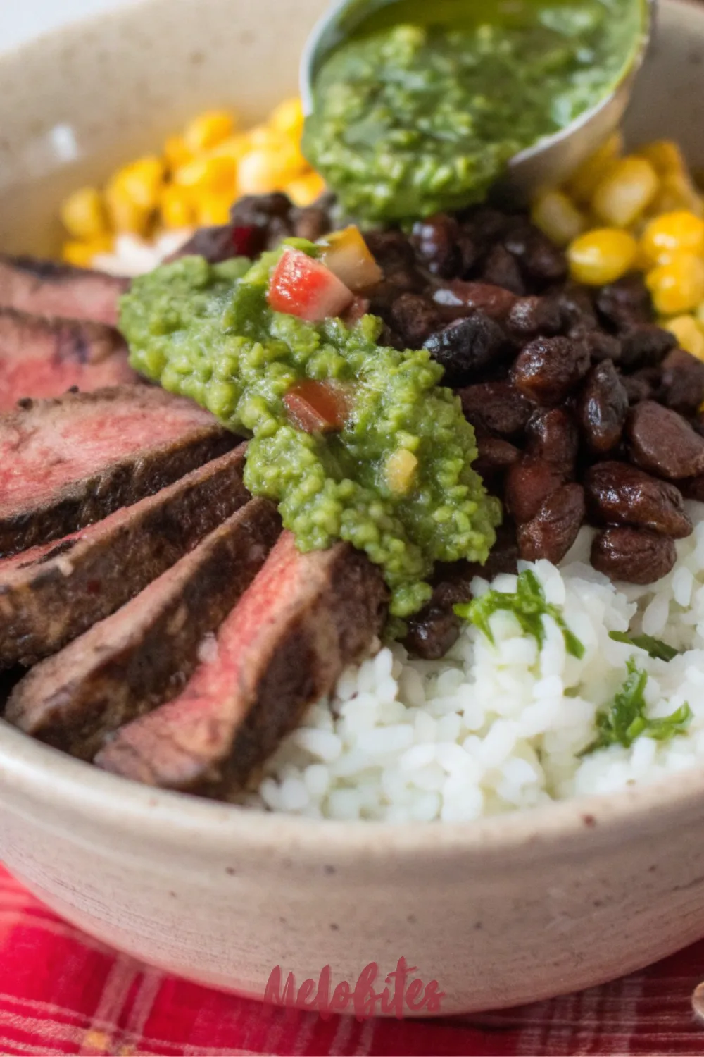 At the base, you have your foundation, a simple bed of rice that’s ready to soak up all the delicious juices from the steak and the zesty sauce. Then comes the star protein, tender, savory slices of perfectly cooked steak, providing a rich and satisfying element. The final, transformative touch is the chimichurri, a vibrant green sauce that drapes over everything, tying the entire bowl together with its fresh, garlicky, and tangy punch.